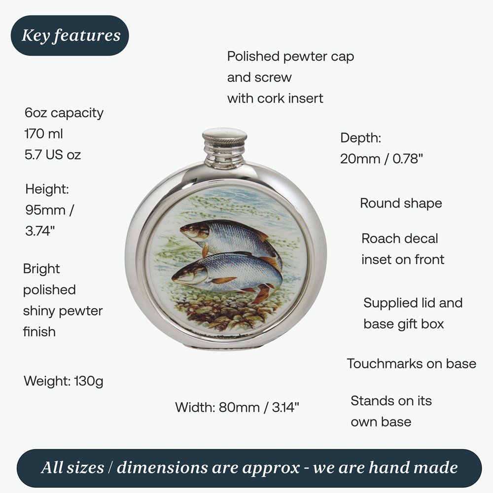 6oz Round Roach Pewter Picture Flask